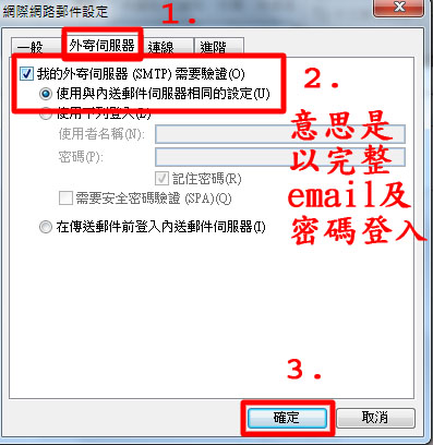 Step 5.1.1. 選取「外寄伺服器」頁籤,將「我的外寄伺服器(SMTP)需要驗證」打勾,並使用第一個選項「使用與內送郵件伺服器相同的設定」